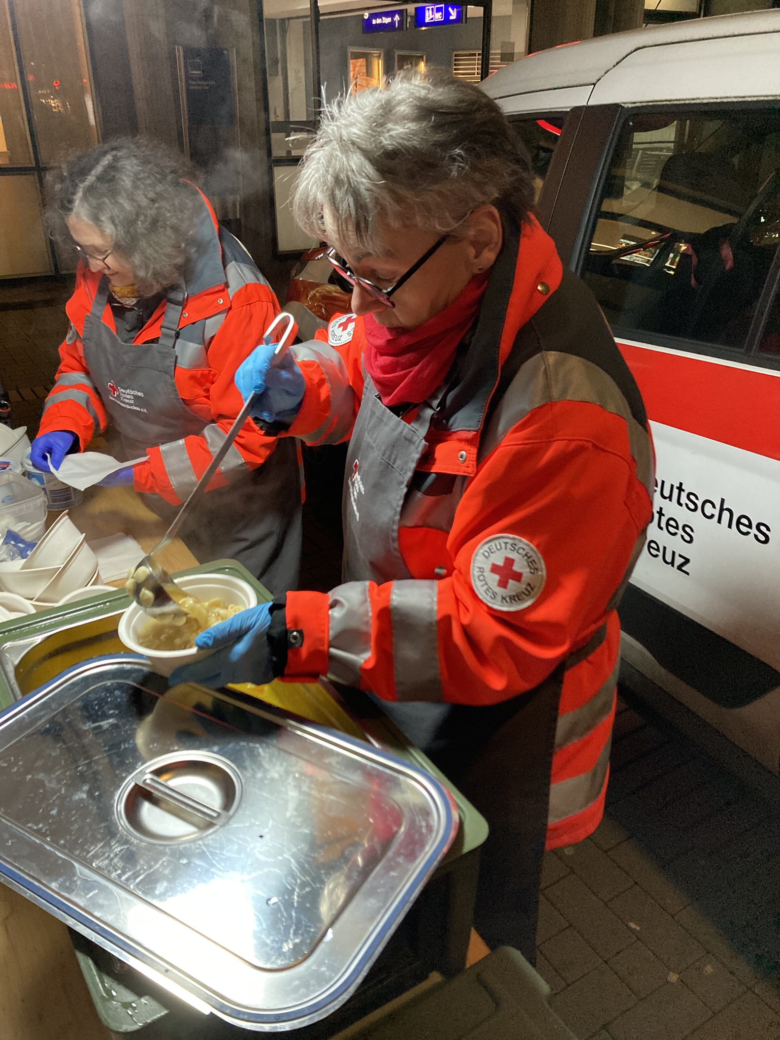 Der Bus des DRK-Kreisverbandes Herne und Wanne-Eickel steht ganzjährig jeden Dienstagmittag an einem zentralen Ort im Stadtteil Wanne und bietet warme Mahlzeiten und Getränke an. Auch der Kältebus des DRK-Kreisverbandes Gütersloh fährt einmal pro Woche seinen Standort an. Die Helferinnen und Helfer des DRK Gelsenkirchen fahren einmal in der Woche zu Stationen in den Gelsenkirchener Stadteilen Buer, Horst und Erle, um Menschen mit dem Nötigsten zu versorgen: einer warmen Mahlzeit, warmer Kleidung und Hygieneartikeln. „Besonders die warme Mahlzeit am Abend kommt gut an“, erzählt Katrin Dünker, die das Projekt von Beginn an betreute und aufbaute.